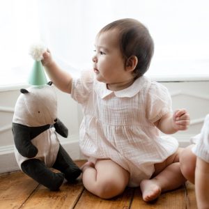 Dress for the occasion with this soft blue muslin bubble. finished with a collar for timeless baby charm Simple and classic newborn essential Muslin gauze Peter pan style collar Bubble silhouette Snap opening along diaper line 100% organic cotton Style # LY32587