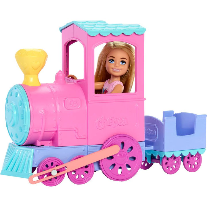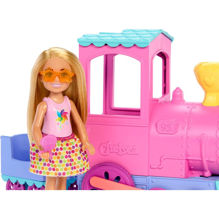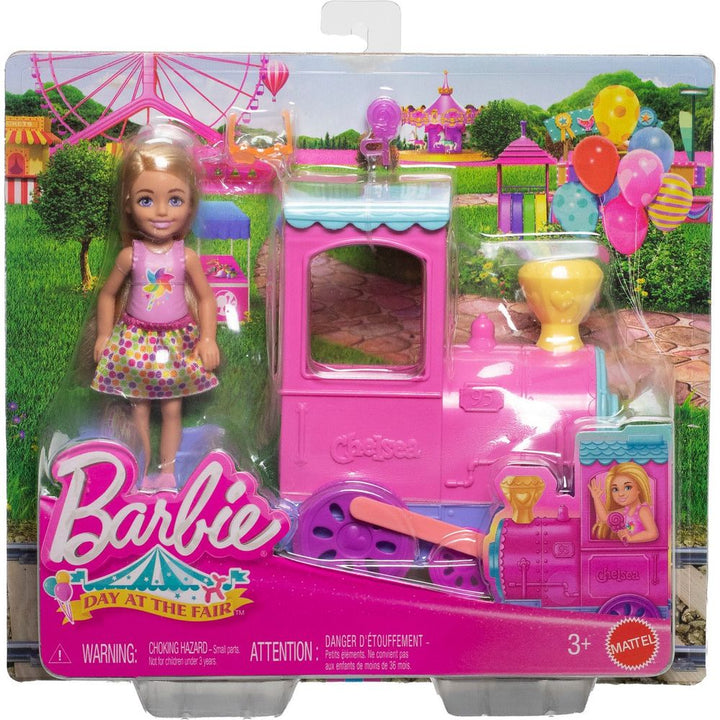 All aboard with Chelsea! This Barbie Day at the Fair playset is choo-chooing with fun featuring a toy train with 10 wheels that really roll and an attachable car. Help Chelsea doll hop on, then push to get the adventures rolling! Accessories include starry sunglasses and a lollipop that really fits in Chelsea doll's ha