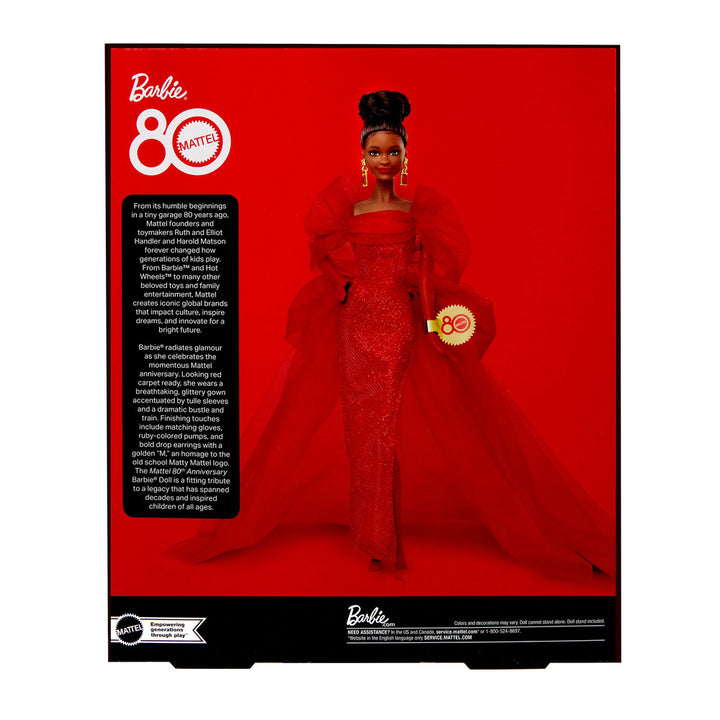 Eight decades of iconic toymaking warrants a special design to mark the occasion. Behold our Mattel 80th Anniversary Barbie doll, a stunning keepsake that honors the legacy of a company that has inspired generations. She looks red carpet-ready in a glittery gown accentuated by bow-like sleeves and a dramatic tulle bust