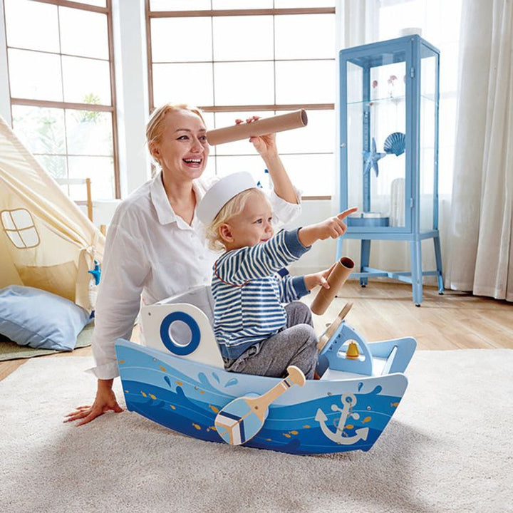 Set sail on endless imaginative adventures with our interactive toy boat. Features oars, a steering wheel, and a hook for a captivating playtime experience. SUPPORTS THEIR MOTOR SKILLS: By rowing and steering, children can develop their fine and gross motor skills. REALISTIC SOUNDS: When you turn the steering wheel, it