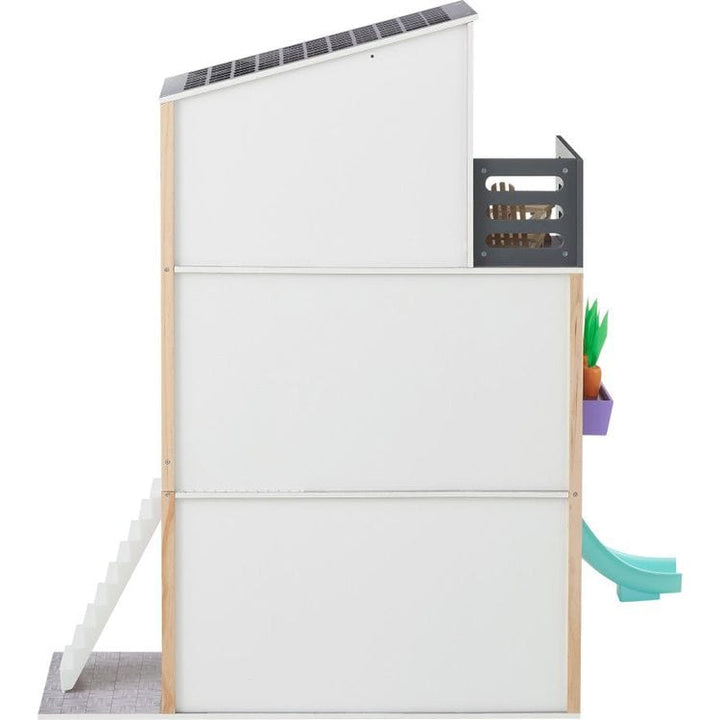 Teamson Kids' Dreamland Boho Beach House is a three-story, five-room, intricately illustrated home for 12" fashion dolls with vivid colors and contemporary furnishings. Featuring a 19-piece furnishing set that includes a stylish Adirondack Chair and side table and a faux macrame hanging egg chair. Exterior additions in
