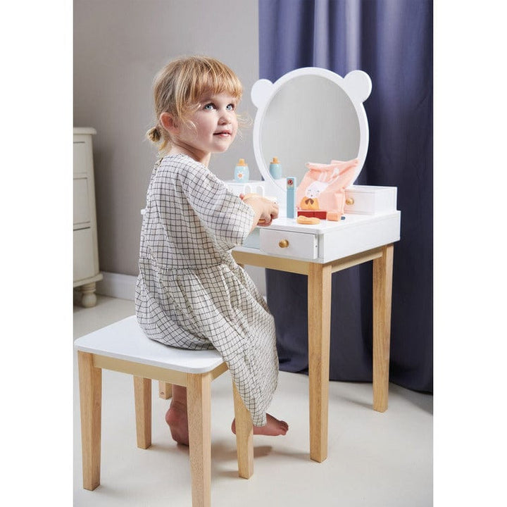 Part of our beautiful forest furniture collection, this dressing table and stool is perfect for any little boy or girl. With a total of 5 drawers, there is plenty of storage for little treasures. A generous large round mirror inspired by our forest friends. Material:Â Wood, Acrylic Mirror Clean with warm towel. Do not u