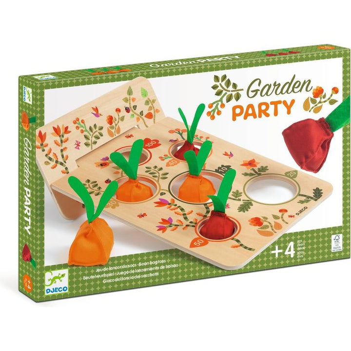 Garden Party is a bag-toss game: who will win the most points by getting the most bags in the holes? But remember: the number of points depends on the size of the hole! The bigger the hole, the fewer the points. A timeless classic skill game for children! An updated bag-toss game with weighted bags shaped like vegetabl