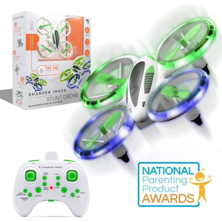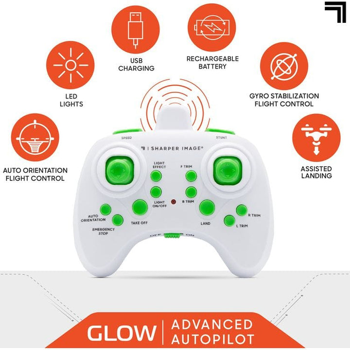 Flip, drift, and climb through the air with the Thunder Glow Drone from Sharper Image! Perfect for beginners, this compact copter and small remote are all you need to perform exciting stunts and fearless tricks! Glowing built-in LED lights make the stunts even more impressive, day or night. This impressive pint-sized p