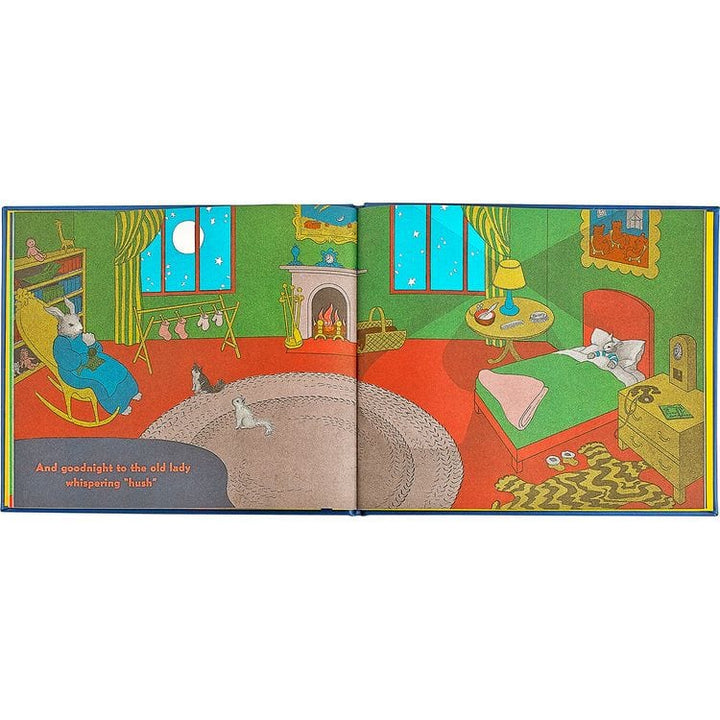 In a great green room, tucked away in bed, is a little bunny. "Goodnight room, goodnight moon." And to all the familiar things in the softly lit room–to the picture of the three little bears sitting on chairs, to the clocks and his socks, to the mittens and the kittens, to everything one by one—the little bunny says g
