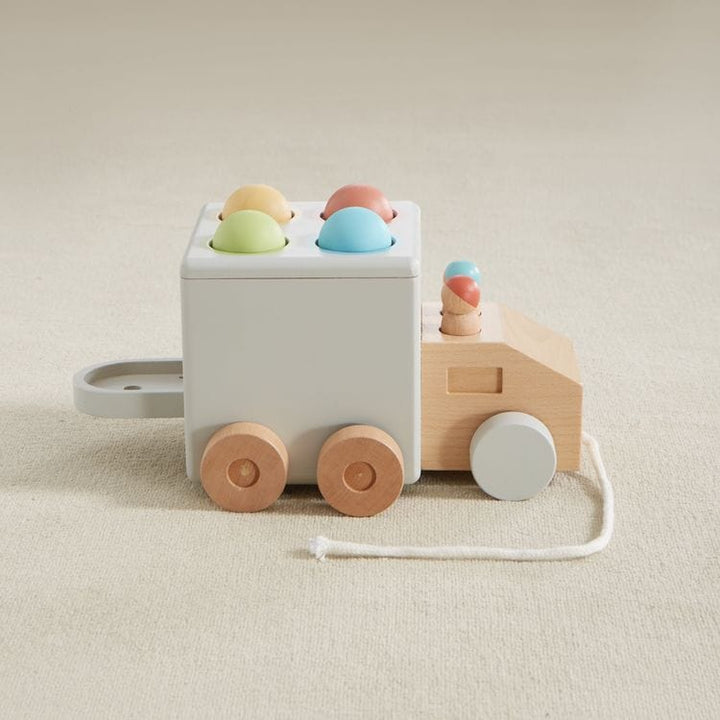 So much to keep baby busy with our Hammer Time Pull Toy. Not only is it a fun pull toy with little wooden drivers, but it’s also a pounding toy and a color matching game. Kiddos will love to pound the giant wooden balls through the matching color holes, then let them all come out by releasing the rear door. Comes wi