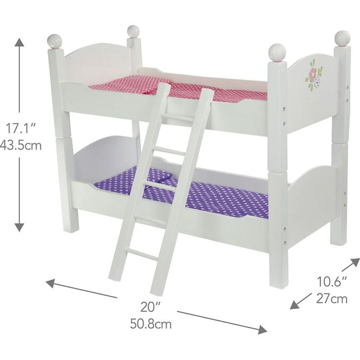 A convertible bunk bed for 18" Dolls – stack as a bunk bed, or separate as a pair of single beds, includes a ladder in a white finish Realistic, almost miniature versions of real-life furnishings with rounded headboards, footboards, and rounded finials on the top bunk Includes a set of pink and a set of purple polka-do