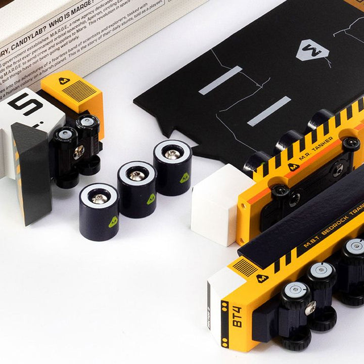 MARGE: Mars Agency for Research + Geographical Exploration The Sector 9 play set includes the powerful and essential building vehicles of the MARGE team. What's in the box? AV-Dozzie with magnetic bulldozer blade MBT with suspension base M.R. Tanker with 6 magnetic fuel cells Puzzle roads Sector 9 Comic Book Dimensions