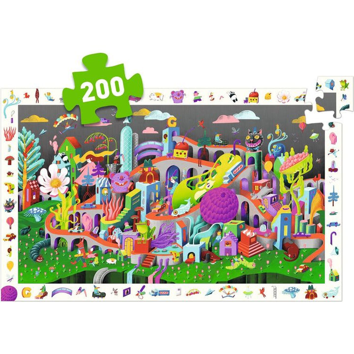 Piece together a fantastical city with Djeco Observation Puzzle 200pc – Crazy Town! This premium puzzle doubles as an observation game, challenging you to find hidden items in the rich and detailed illustrations. Plus, use the full-sized poster as a reference for even more fun. Ages: 6 years and older Puzzle is 61 x 38