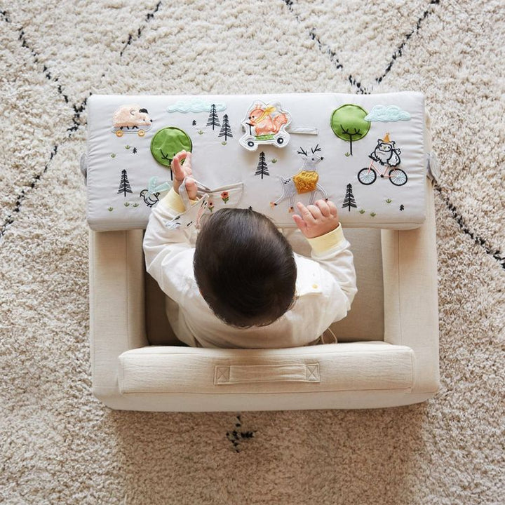 It’s hip to be a square…chair, that is. Our Rolling Along Square Chair is the perfect place for baby to hang out (when they are able to sit up by themselves) and play with all of the interactive toys on the tray. They will delight in the sounds of the crinkle, peek-a-boo flap, squeakers, and movable characters, and w