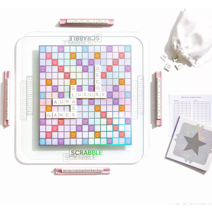 Game night gets a glow-up with Scrabble Aura Edition. This high-quality glass game board shimmers with serene colors that reflect the vibe of any room. Smoothly rotate the board and watch as iridescent foil accents illuminate every word, creating a mesmerizing play of light and color. Express your personal style like n