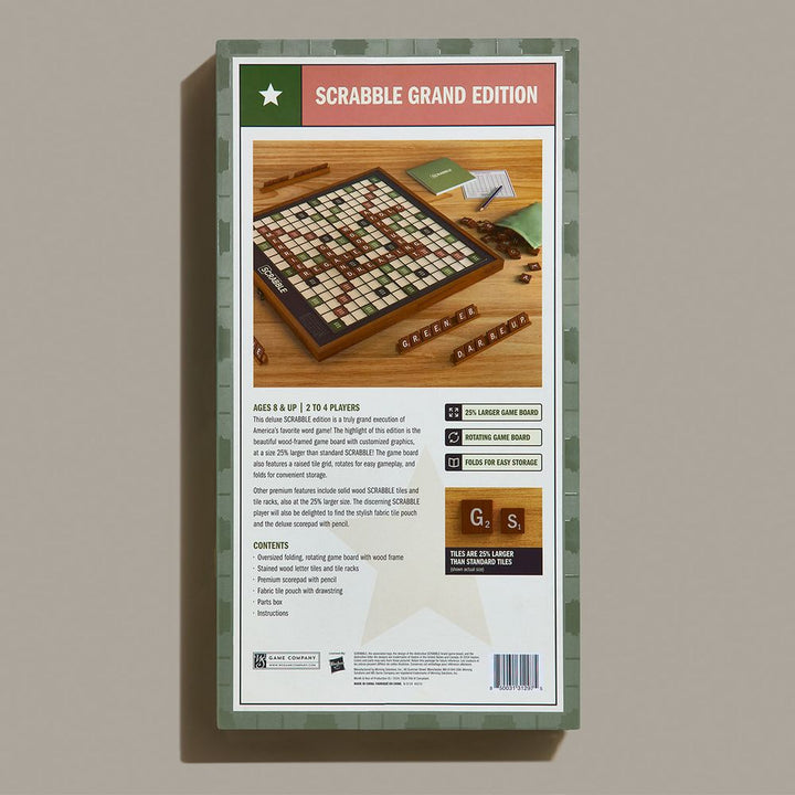 Enhance your next Scrabble match with our Grand Folding Edition. This premium wooden set transforms America’s favorite word game into a beautiful addition to your home. The oversized game board, attractively framed in wood, features a folding, rotating design for convenient gameplay and easy storage. Premium details in