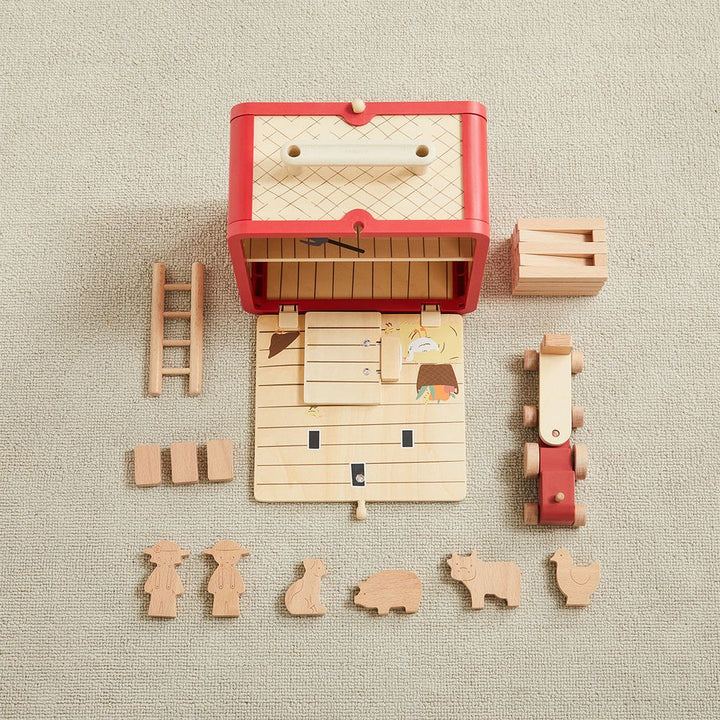 Your kiddos will love our Take with Me Farm. It comes with 13 wooden pieces including animals, farmers, vehicles, bales of hay, a fence and much more.  But the best part is kids can pack up all the pieces into the carry along barn (with functioning door) and go anywhere. Perfect for car rides, plane rides, or just