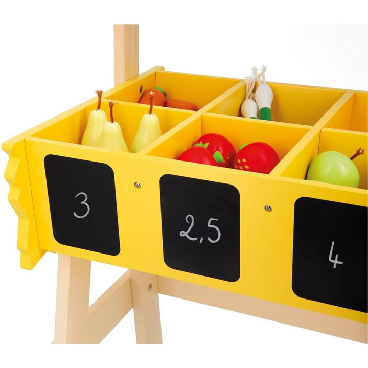 The small producers' market is open! Our wooden Farm Market is the ideal toy for children aged 3 years and up who’ll love pretending to run their own business. This beautiful pretend play toy is equipped with numerous accessories for an enriching and realistic play experience. A total of 58 accessories complete this ch