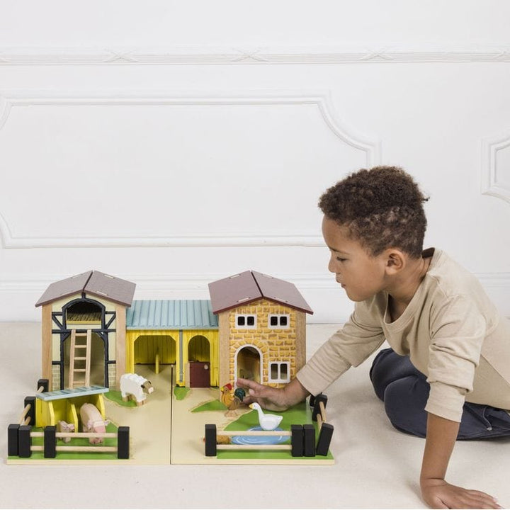 The Classic painted wooden  farmyard from LE TOY VAN. The playset includes a large barn with hay loft, a  milking parlour, a stable, and a pigsty. Mounted on a detailed decorated baseboard and complete with movable fences. (Scaled to Budkins animals & characters & compatible with standard plastic animals – Anim